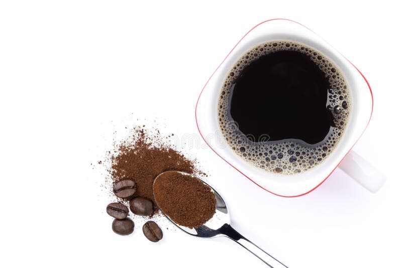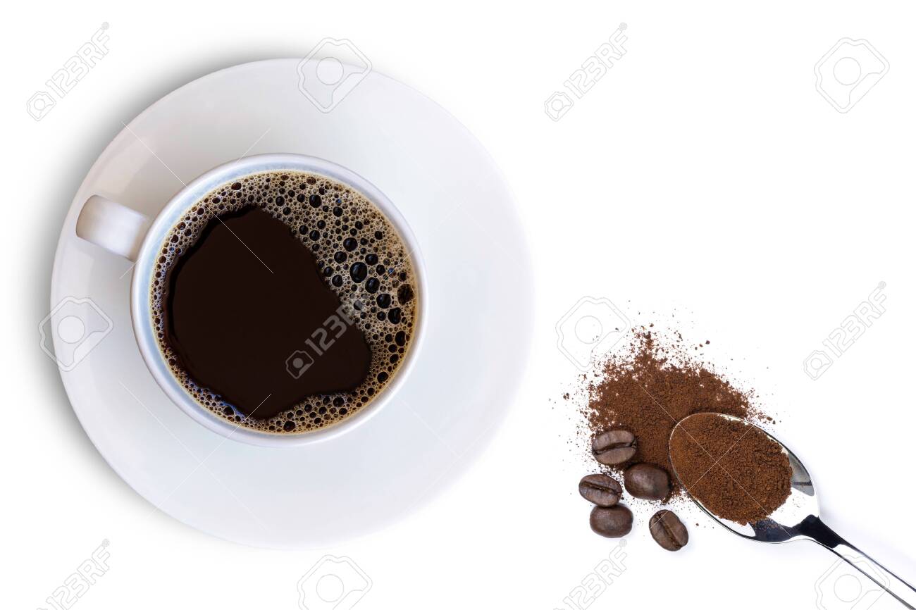 Closeup White Cup Of Black Coffee And Instant Coffee Powder In Stainless Teaspoon With Coffe Beans Isolated On White Background Space For Text And Content Top View Flat Lay Stock Photo Picture